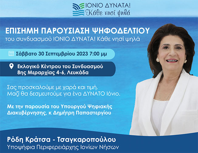 Ø Η Ρόδη Κράτσα-Τσαγκαροπούλου παρουσιάζει στη Λευκάδα το ψηφοδέλτιό της ενόψει των περιφερειακών εκλογών της 8ης Οκτωβρίου και σας προσκαλεί στο εκλογικό κέντρο του συνδυασμού της «ΙΟΝΙΟ ΔΥΝΑΤΑ! Κάθε νησί ψηλά»