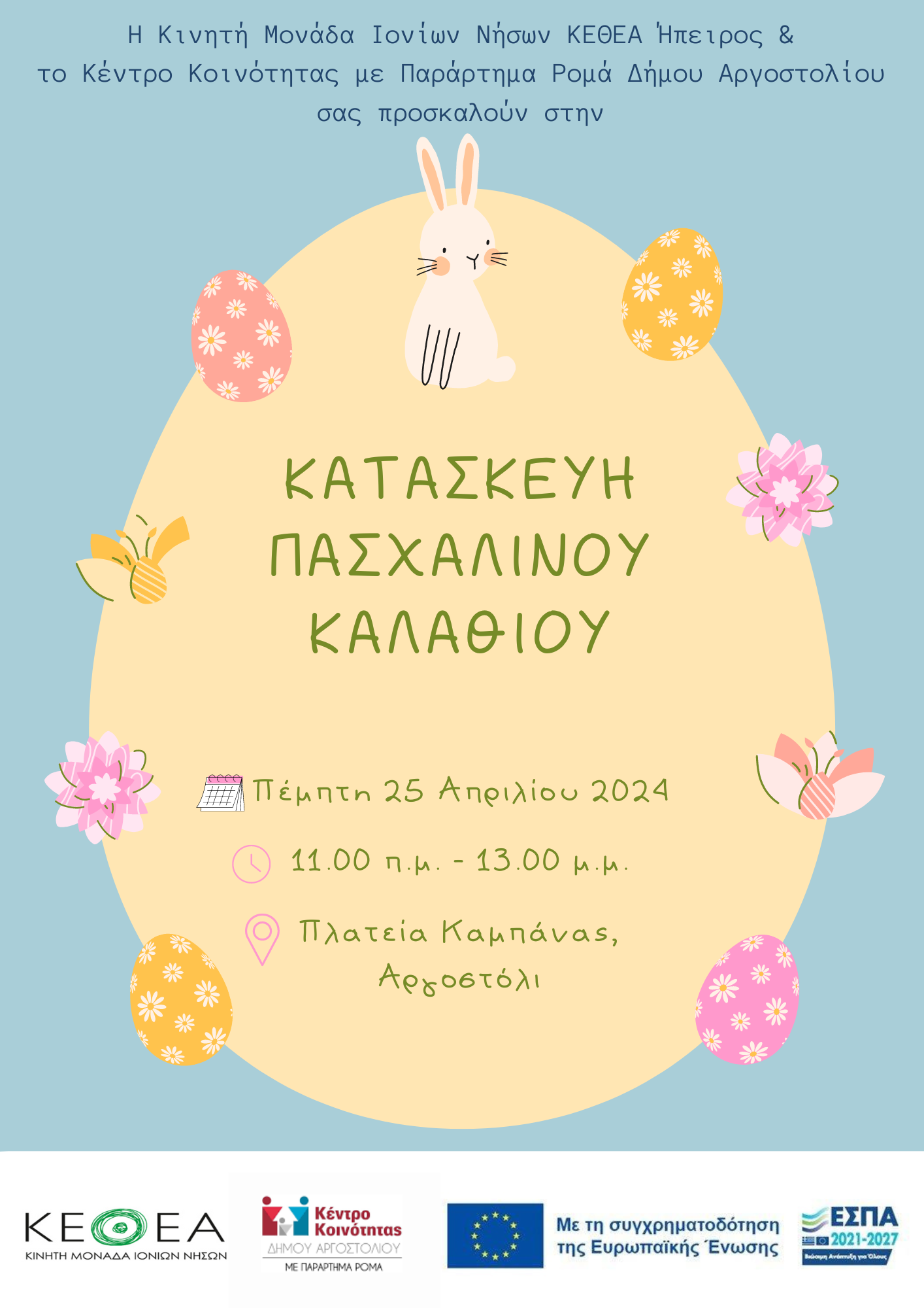 Το προσωπικό της Κινητής Μονάδας Ιονίων Νήσων του Κέντρου Θεραπείας Εξαρτημένων Ατόμων (ΚΕΘΕΑ), σε συνεργασία με το Κέντρο Κοινότητας με Παράρτημα Ρομά Δήμου Αργοστολίου σας προσκαλούν στην κατασκευή Πασχαλινού Καλαθιού που θα πραγματοποιηθεί την Πέμπτη 25 Απριλίου 2024 και ώρες 11.00 π.μ. – 13.00 μ.μ., στην Πλατεία Καμπάνας στο Αργοστόλι.