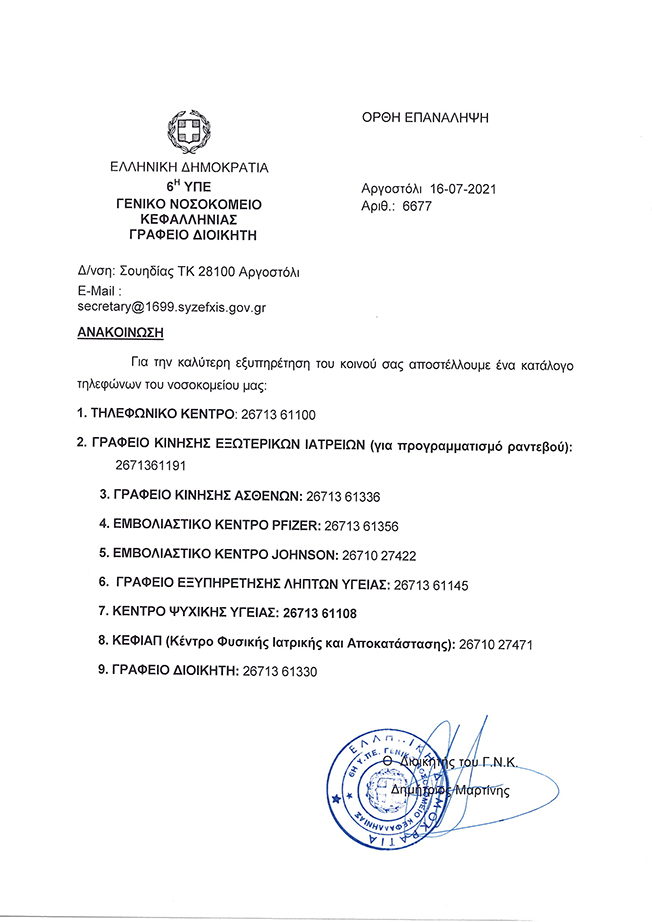 Πλήρης κατάλογος τηλεφώνων του Νοσοκομείου