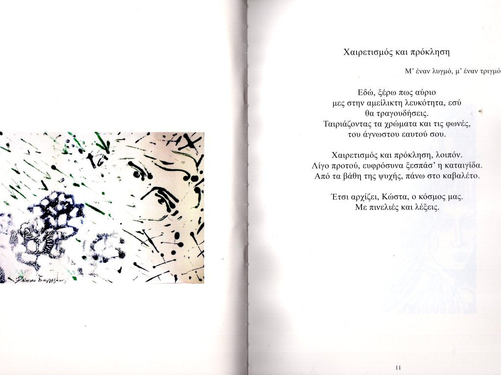 Τίτλοι των ποιημάτων που αναφέρονται στα αντίστοιχα ζωγραφικά έργα: Αντί προλόγου, Χαιρετισμός και πρόκληση, Δεν αρκούνε τα μάτια, Πολύφημος πόνος, Ένα βλέμμα αρκεί, Συνάντηση, Ανθισμένος λόγος, Ήτανε Κυριακή, Ροδογραφία, Κι όμως, Όταν, Κύκλος-νέφη-καρδιά, Πάνω σε ένα χρώμα, Κάπως έτσι, Ο εγκλεισμός, Σαν όνειρο, Προσωπογραφία, Συνθέσεις νέας κβαντικής, Με χίλια μάτια η νύχτα, Είπε το δέντρο.