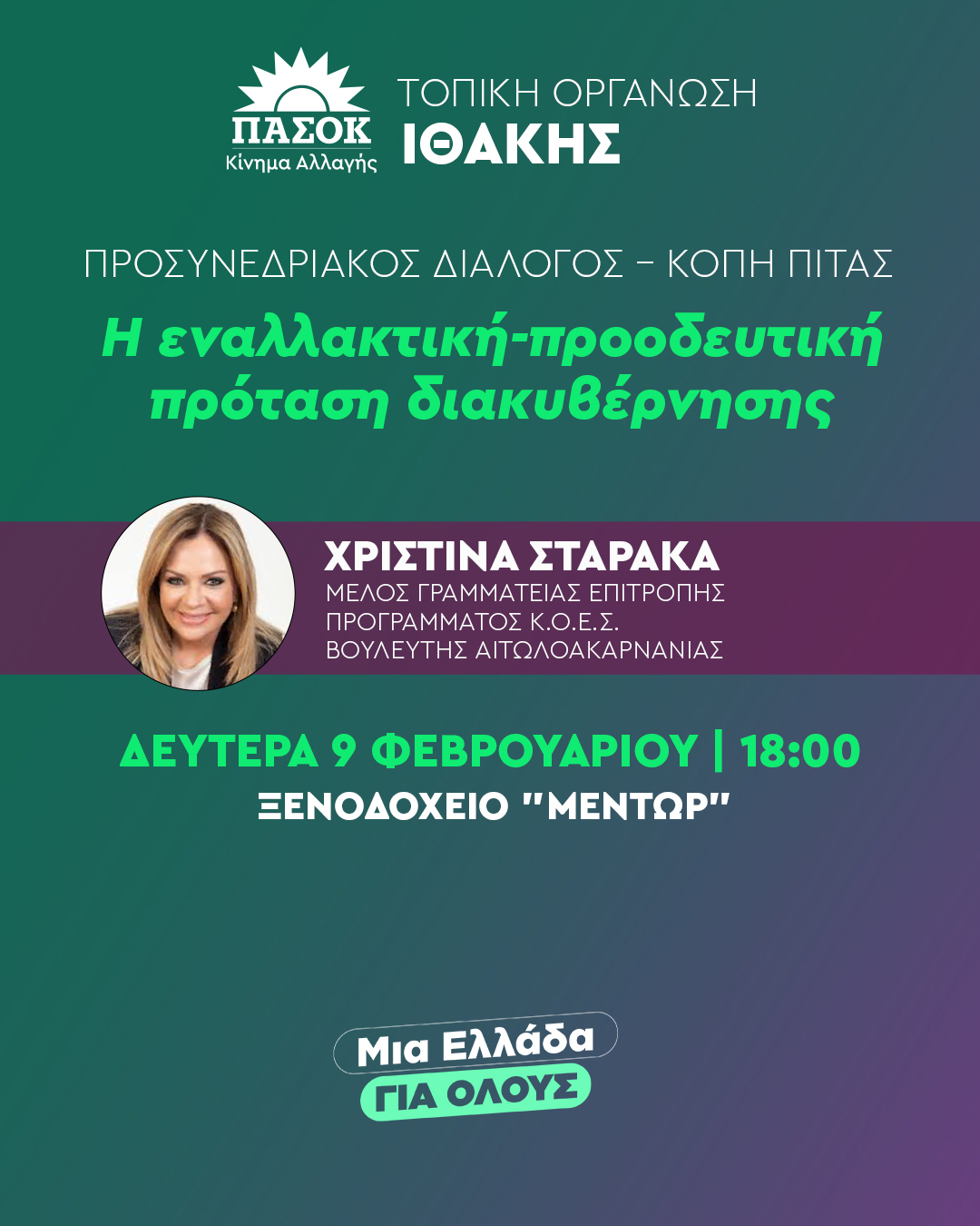 Σας περιμένουμε όλες και όλους στη Πολιτική Εκδήλωση της Τοπικής Οργάνωσης του ΠΑ.ΣΟ.Κ. – Κινήματος Αλλαγής Ιθάκης με ομιλήτρια τη Χριστίνα Σταρακά, Βουλευτή Αιτωλοακαρνανίας.