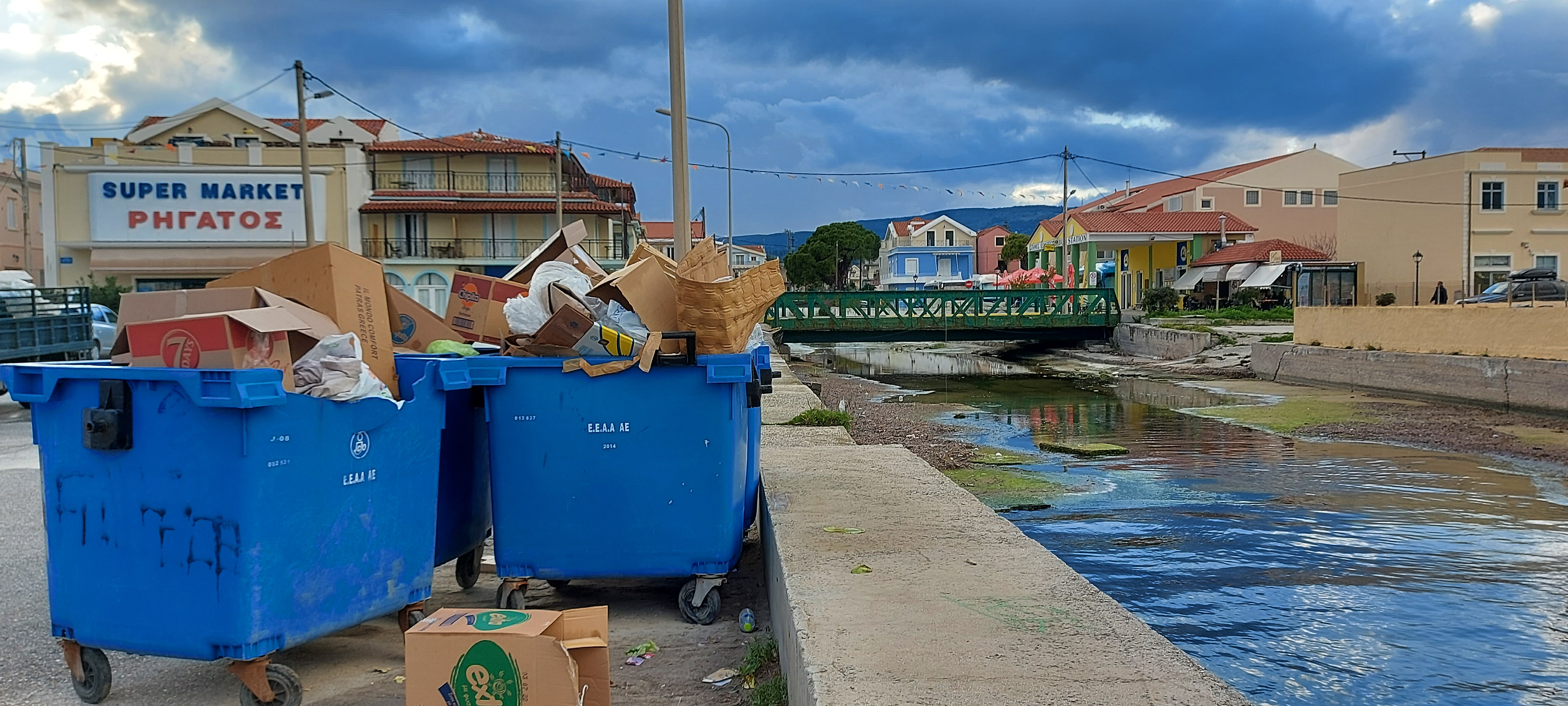 Πολλά τα παράπονα από το Ληξούρι και όσα συμβαίνουν δίπλα στο ποτάμι στους κάδους, εφόσον όσα χαρτόκουτα που ρίχνουν στους μπλε κάδους ανακύκλωσης καταλήγουν στο ποτάμι.