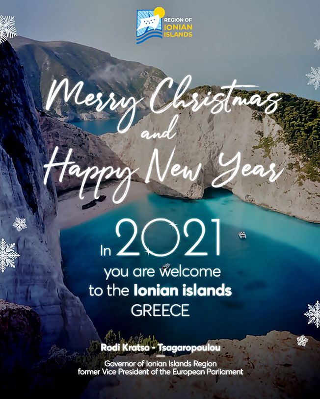 Παράλληλα με την επιτυχημένη καμπάνια στα κινητά σε όλη την Ελλάδα, όπου ξεδιπλώνεται ο πλούτος των Ιονίων για όλες τις εποχές, την εικόνα του κατ’ εξοχήν τουριστικού προορισμού, η Περιφερειάρχης συνδύασε με τις ευχές των εορτών σε τουριστικούς φορείς, συνεργάτες, φίλους ανά τον κόσμο για να στείλει το μήνυμα του ελκυστικού Ιονίου εν αναμονή να τους υποδεχθεί το 2021!