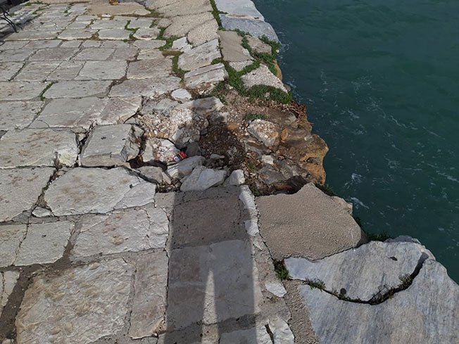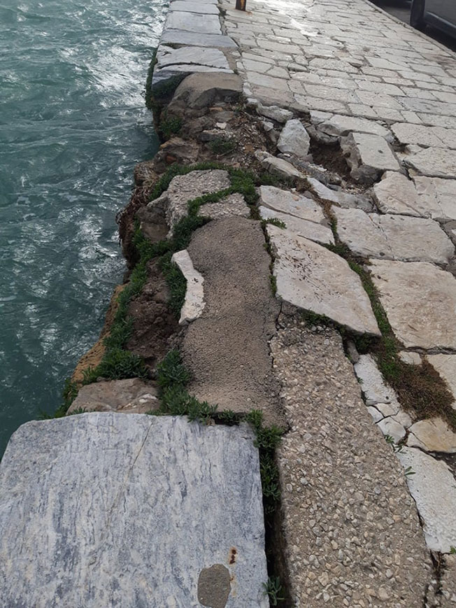 Υπάρχει ζήτημα ασφάλειας και πιθανής κατάρρευσης στο παραλιακό μέτωπο στην Προκυμαία της πόλης Ζακύνθου, το οποίο προφανώς δεν αφορά μόνο το Λιμενικό Ταμείο. Όπως φαίνεται και από τις φωτογραφίες (φωτο 1-4) υπάρχει υποχώρηση (διαχωρισμός) μέρους του  πεζοδρομίου προς την μεριά της θάλασσας.