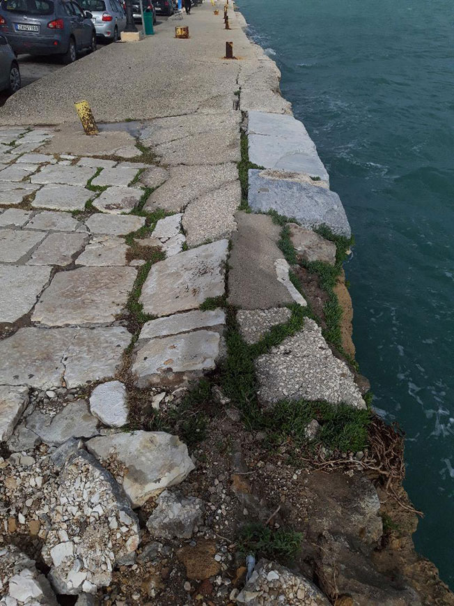 Το πρόβλημα υφίσταται εδώ και πολλούς μήνες, αλλά εσχάτως έχει επιδεινωθεί επικίνδυνα όπως φαίνεται από τις φωτογραφίες (φωτο 1-4). Μέχρι το καλοκαίρι υπήρχε πλαστικό πλέγμα αρκετών μέτρων που εμπόδιζε την πρόσβαση. Το καλοκαίρι αφαιρέθηκε (για να μην ενοχλούνται οι τουρίστες αισθητικά;) ΧΩΡΙΣ να έχει προηγηθεί ΚΑΜΙΑ παρέμβαση. Το παραλιακό πεζοδρόμιο φυσικά εφάπτεται στον παραλιακό δρόμο που έχει μεγάλο κυκλοφοριακό φόρτο, διέρχονται βαριά οχήματα και φυσικά η πίεση της θάλασσας είναι συνεχής και απαιτεί άμεση λήψη μέτρων.