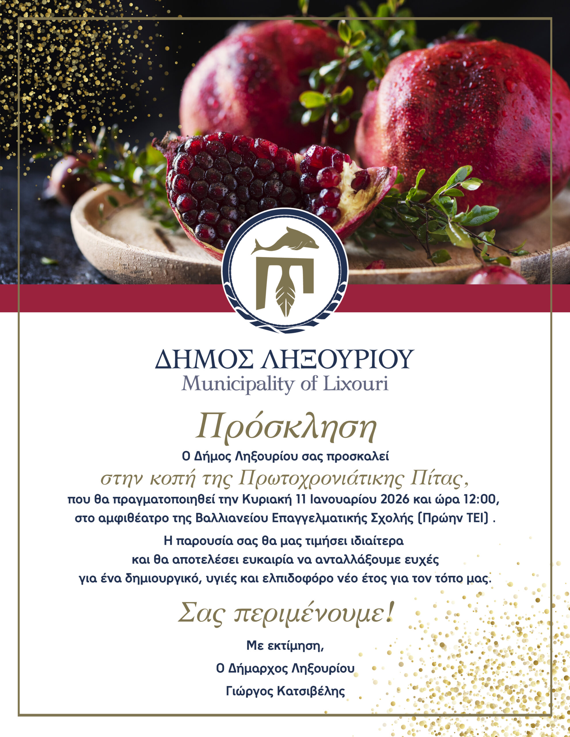 Ο Δήμος Ληξουρίου, σας προσκαλεί στην εκδήλωση κοπής της Πρωτοχρονιάτικης Πίτας του Δήμου μας, που θα πραγματοποιηθεί την Κυριακή 11 Ιανουαρίου 2026 και ώρα 12:00, στο αμφιθέατρο της Βαλλιανείου Επαγγελματικής Σχολής(πρώην ΤΕΙ).
