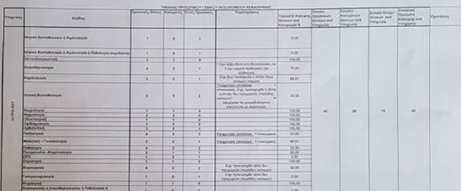 Στον πίνακα αυτόν δεν αναφέρονται τα κενά σε θέσεις ειδικευόμενων γιατρών. Ενδεικτικά στην παθολογική κλινική σε σύνολο επτά θέσεων ειδικευόμενων, υπηρετούν 1ειδικευόμενη και 4 αποσπασμένοι αγροτικοί γιατροί.
