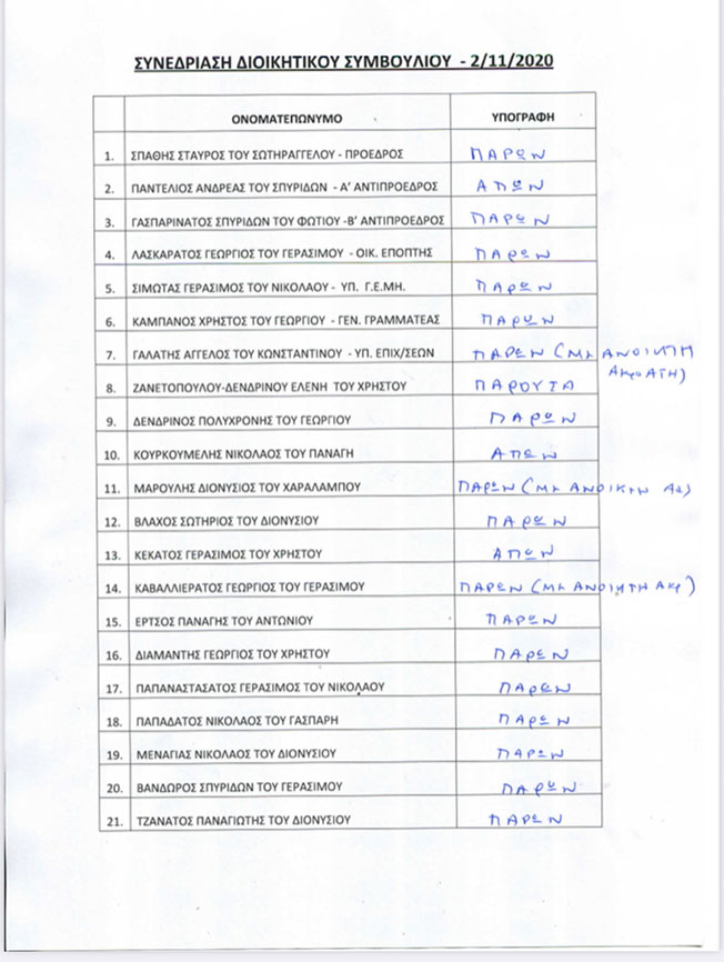 Επειδή όμως μία εικόνα είναι χίλιες λέξεις, συνημμένο είναι το πρακτικό της συνεδρίασης στο οποίο εμφανίζονται παρόντες, μέλη της παράταξή του με ανοιχτή ακρόαση τηλεφώνου! και εξαφανίζονται μέλη της αντιπολίτευσης (Γεράσιμος Κεκάτος) τα οποία ήταν παρόντες.