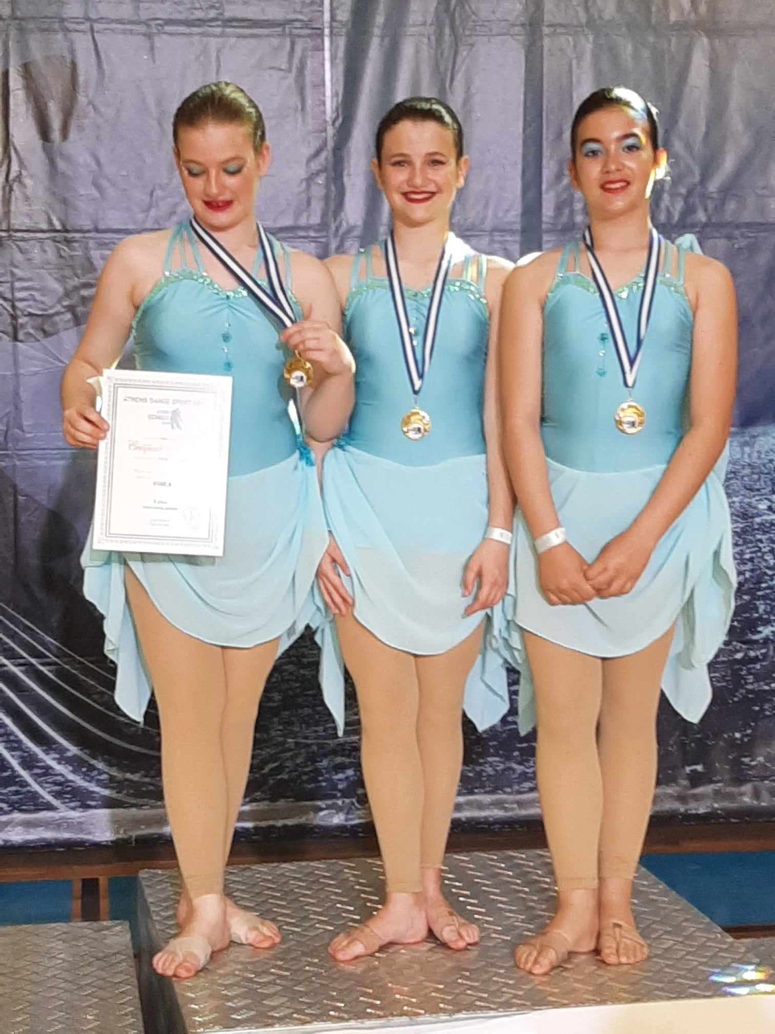 1η θέση μοντέρνο χορό εφήβων (Καλαφάτη Νικολίνα, Κοσμετάτου Ιωάννα, Μπαζίγου Έφη).
