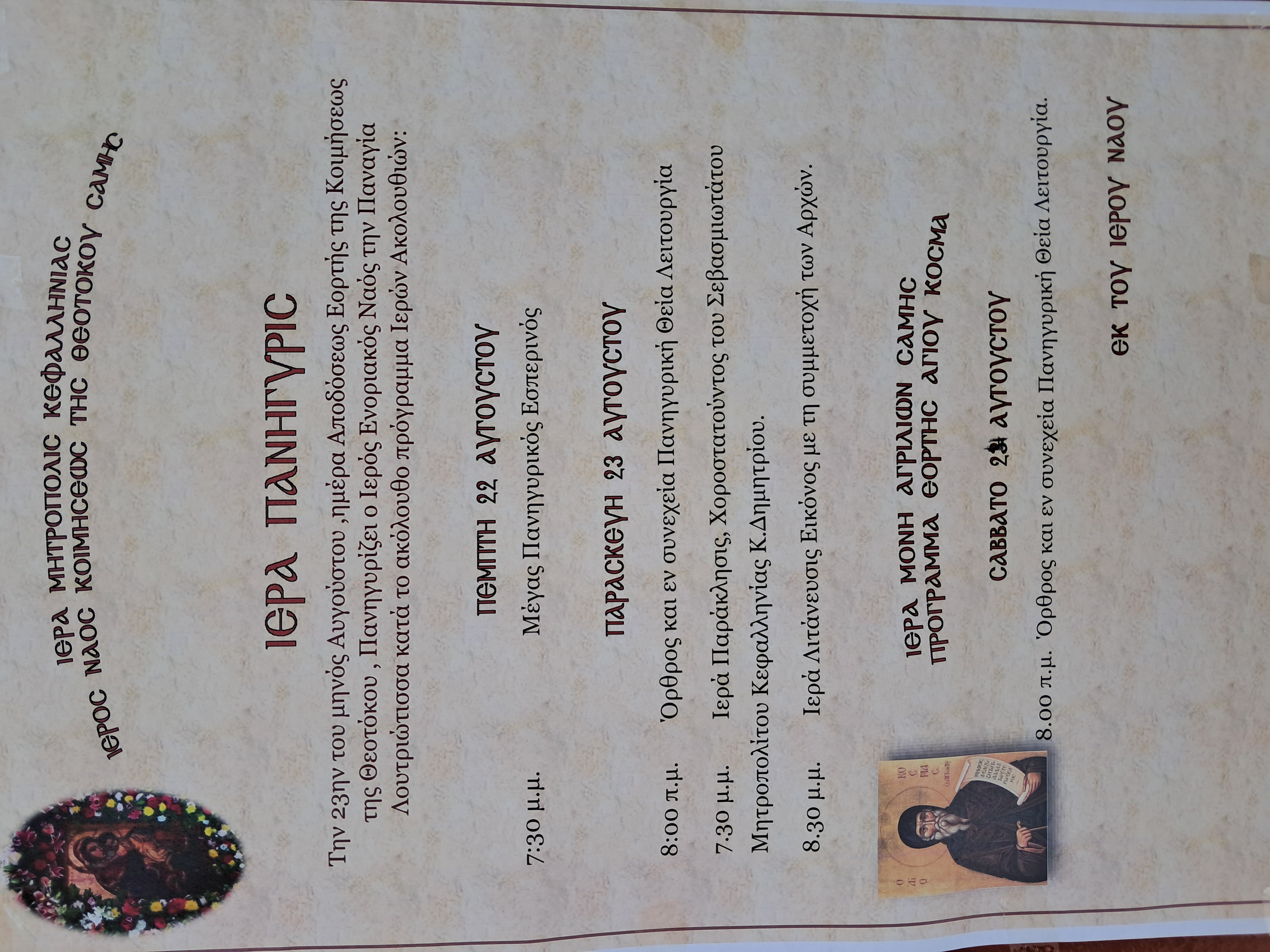 - 19.30 θα πραγματοποιηθεί Μέγας Πανηγυρικός Εσπερινός στον Ιερό Ναό Κοιμήσεως της Θεοτόκου Σάμης.