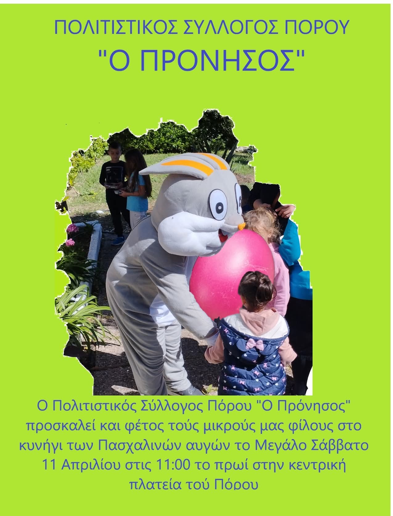 Ο Πολιτιστικός Σύλλογος Πόρου “Ο Πρόνησος” προσκαλεί και φέτος τους μικρούς μας φίλους στο κυνήγι των Πασχαλινών αυγών το Μεγάλο Σαββάτο 11 Απριλίου στις 11: το πρωί στην κεντρική πλατεία του Πόρου.