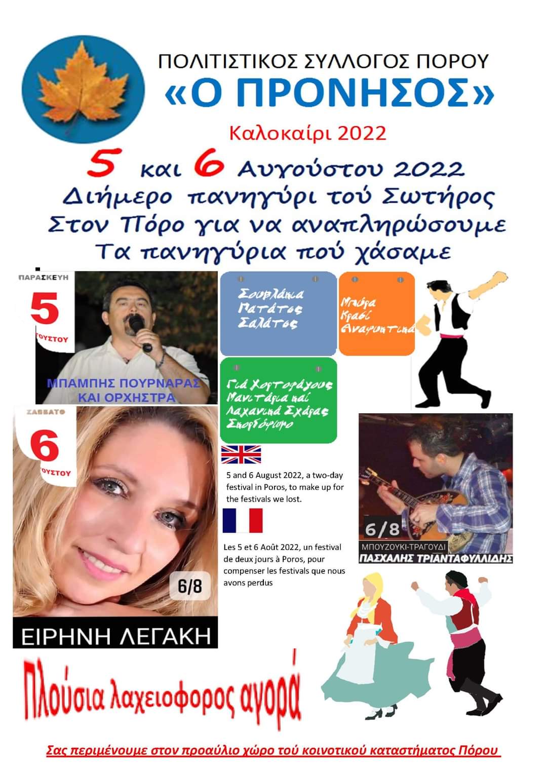 Ο πολιτιστικός σύλλογος του Πόρου «Ο Πρόνησος,» για να αναπληρώσουμε τα πανηγύρια που χάσαμε, σας προσκαλεί σε ένα διήμερο γλέντι την Παρασκευή 5 Αυγούστου και το Σάββατο 6 Αυγούστου, παραμονή και ανήμερα της γιορτής τού «Σωτήρος» αντίστοιχα, στον προαύλιο χώρο του κοινοτικού καταστήματος του Πόρου!