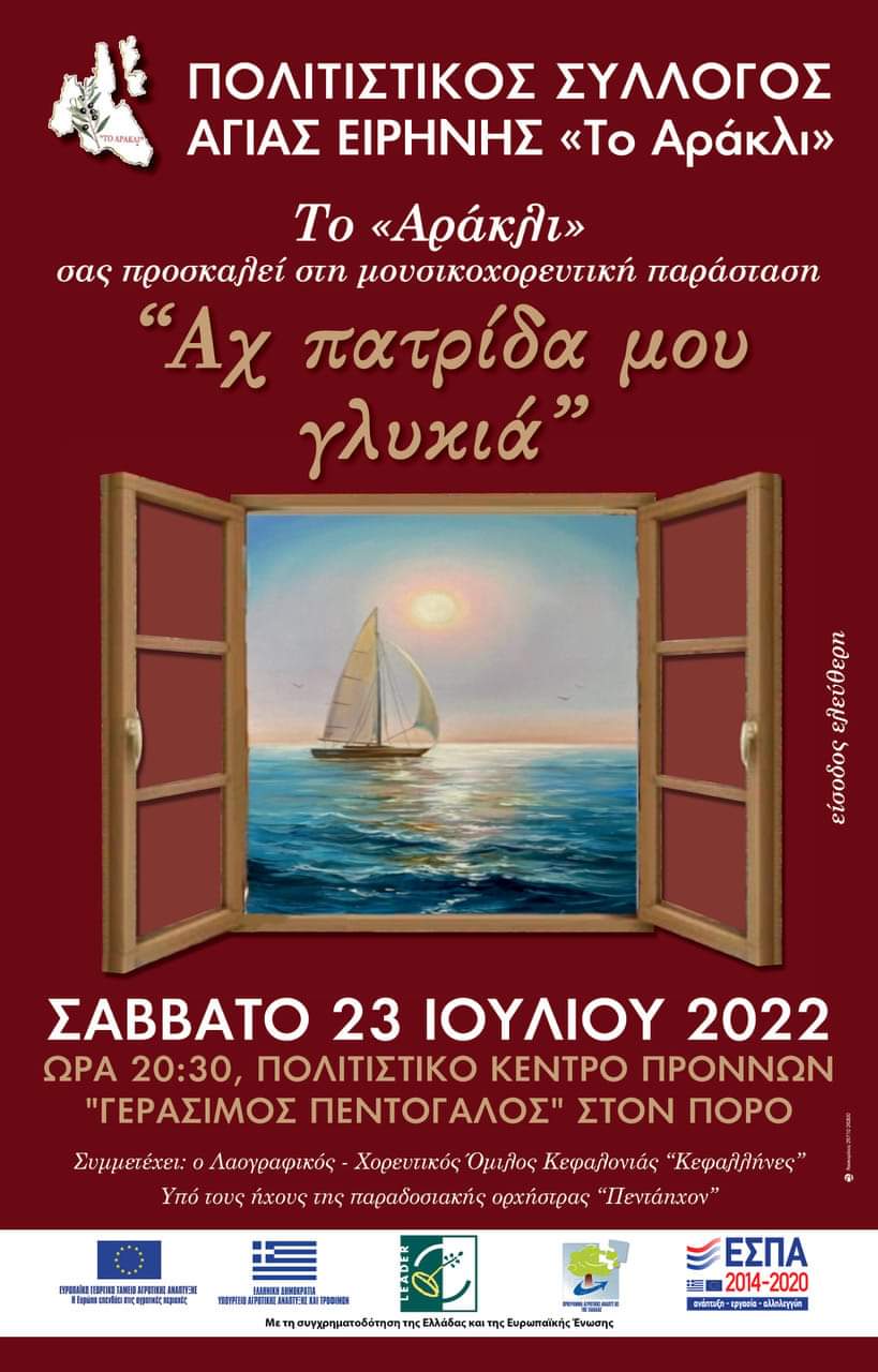 Ο Πολιτιστικός Σύλλογος Αγίας Ειρήνης “Το Αράκλι” σας προσκαλεί στην σπουδαία για τα τοπικά δεδομένα μουσικοχορευτική παράσταση “Αχ πατρίδα μου γλυκιά” που θα πραγματοποιηθεί το Σάββατο 23 Ιουλίου στις 20:30 στο Πολιτιστικό Κέντρο Πρόννων “Γεράσιμος Πεντόγαλος” στον Πόρο της Κεφαλονιάς μας και συμμετέχει ο Λαογραφικός – Χορευτικός Όμιλος Κεφαλονιάς “Κεφαλλήνες” υπό τους ήχους της παραδοσιακής ορχήστρας “Πεντάηχον!”