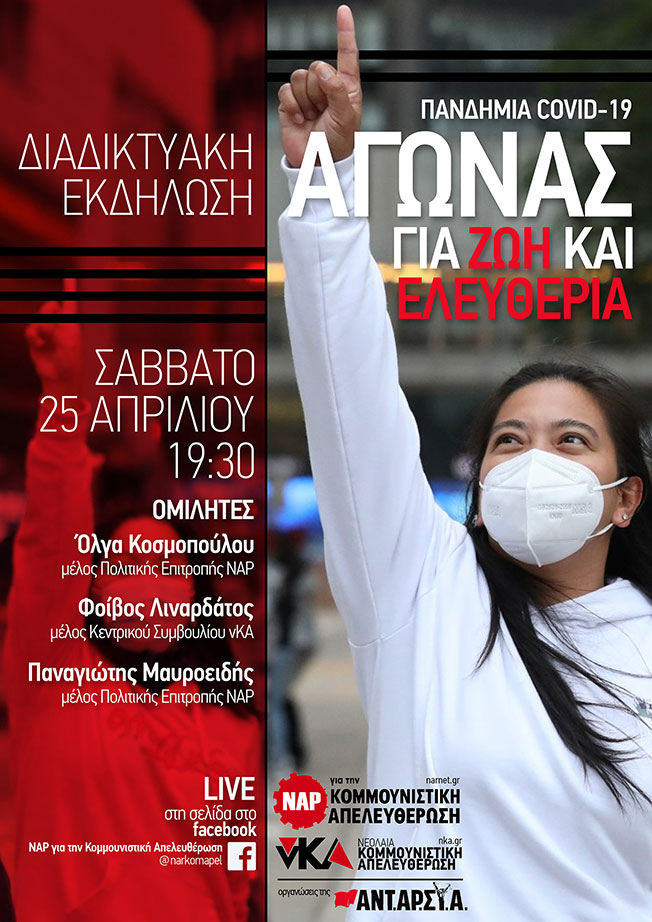 Καθώς έχουμε μπει στην εποχή των διαδικτυακών εκδηλώσεων και συζητήσεων, το ΝΑΡ και η νεολαία Κομμουνιστική Απελευθέρωση διοργανώνουν εκδήλωση μέσω διαδικτύου το Σάββατο 25 Απρίλη 2020, στις 7.30 μ.μ. με τίτλο: