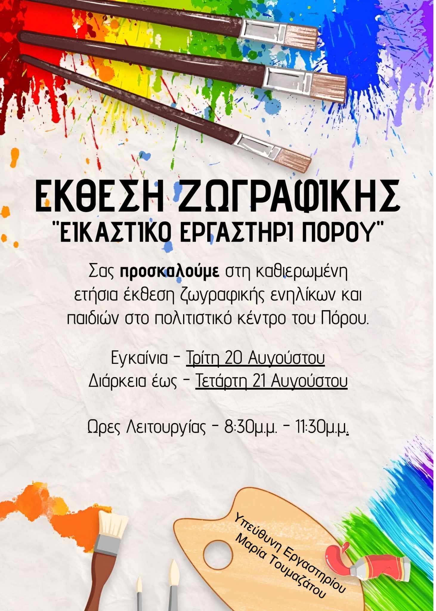 Πρόσκληση για την ετήσια έκθεση ζωγραφικής του καλλιτεχνικού εργαστηρίου του Πόρου!