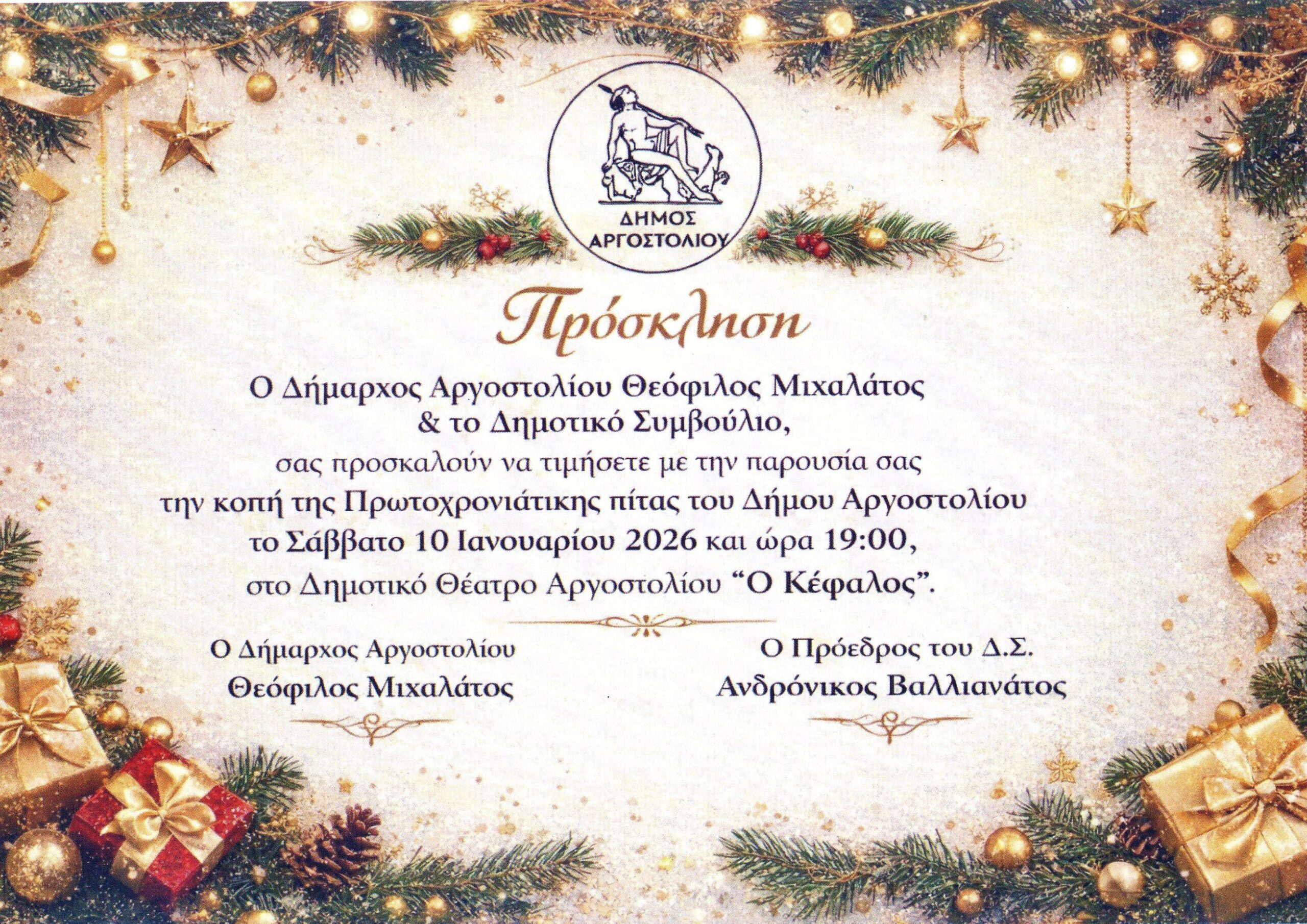Ο Δήμαρχος Αργοστολίου Θεόφιλος Μιχαλάτος και το Δημοτικό Συμβούλιο, σας προσκαλούν να τιμήσετε με την παρουσία σας την κοπή της Πρωτοχρονιάτικης πίτας του Δήμου Αργοστολίου, το Σάββατο 10 Ιανουαρίου 2026 και ώρα 19.00 στο Δημοτικό Θέατρο Αργοστολίου ‘’Ο Κέφαλος’’.