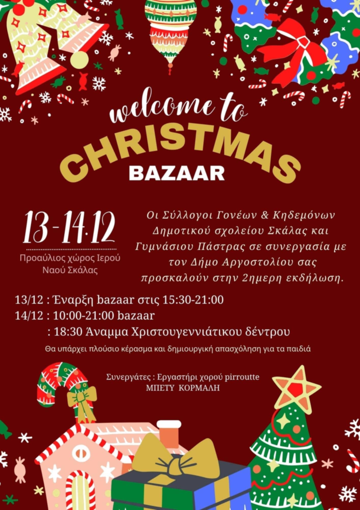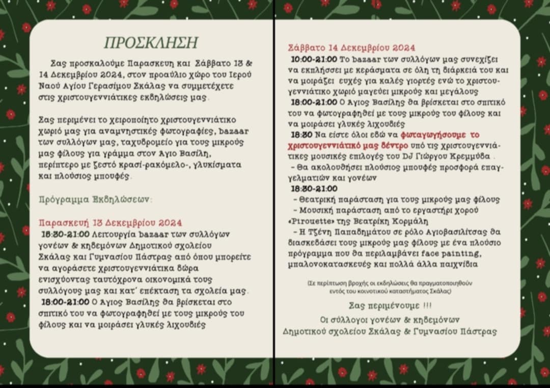 Σας προσκαλούμε Παρασκευή και Σάββατο 13 και 14 Δεκεμβρίου 2024 στον προαύλιο χώρο του Ιερού Ναού Αγίου Γερασίμου Σκάλας να συμμετέχετε στις χριστουγεννιάτικες εκδηλώσεις μας.