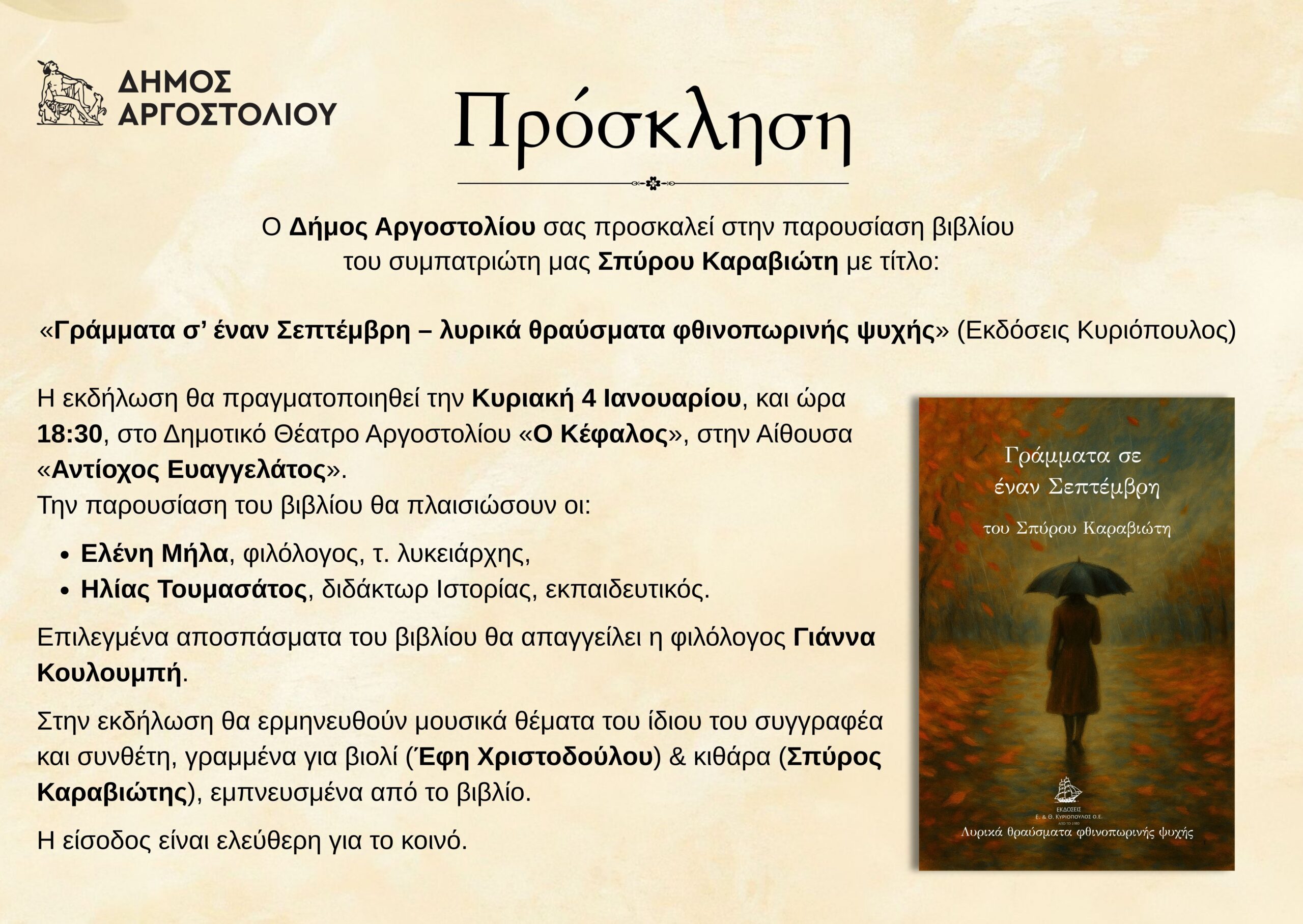 Ο Δήμος Αργοστολίου σας προσκαλεί στην παρουσίαση του βιβλίου «Γράμματα σ’ έναν Σεπτέμβρη» του Σπύρου Καραβιώτη (Εκδόσεις Κυριόπουλος)