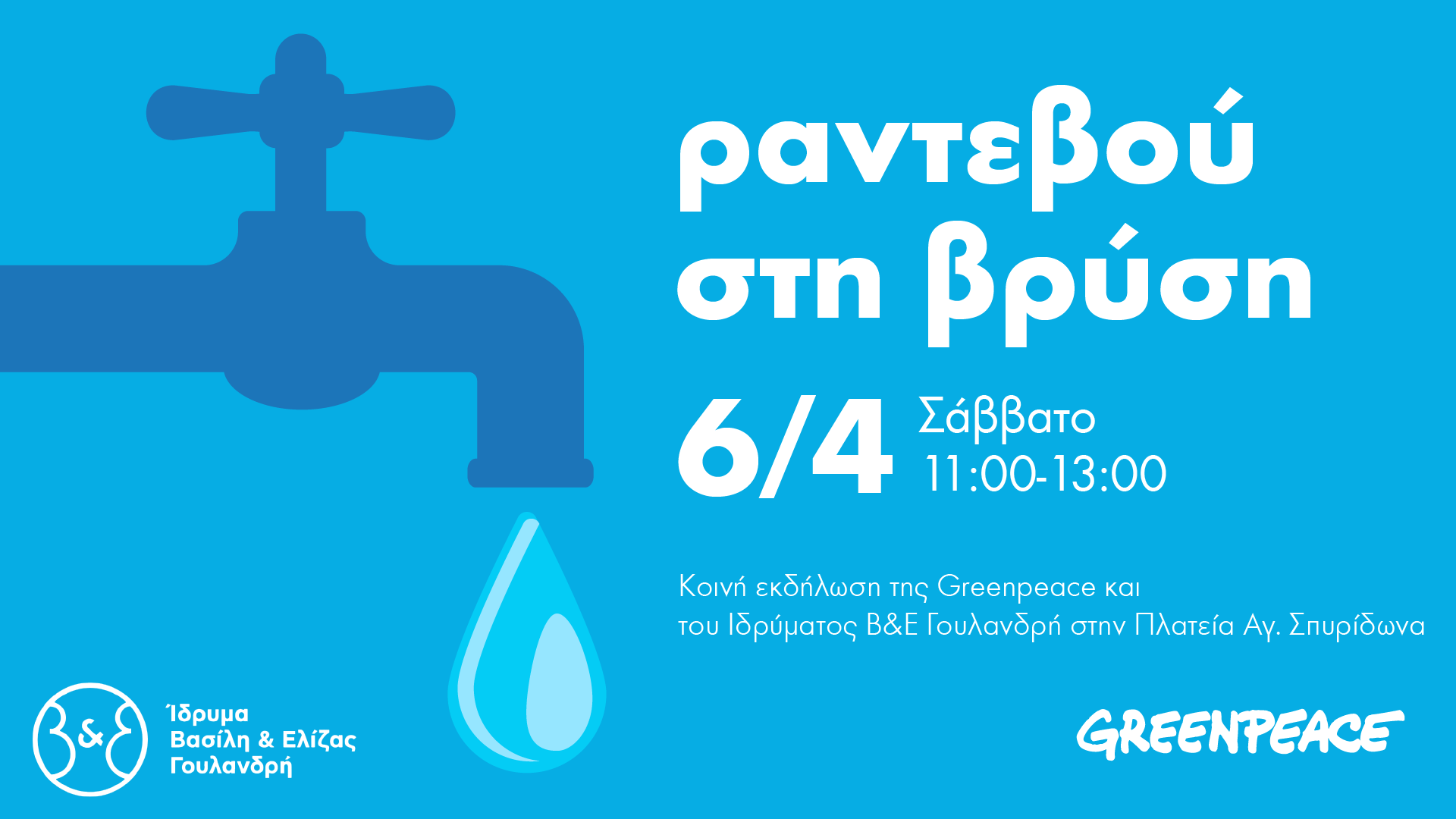 Το Σάββατο 6 Απριλίου, από τις 11.00 έως τις 13.00, το ελληνικό γραφείο της Greenpeace, η εθελοντική της ομάδα και το Ίδρυμα Βασίλη & Ελίζας Γουλανδρή ενώνουν τις δυνάμεις τους στο “Ραντεβού στη βρύση”, μια εκδήλωση που θα πραγματοποιηθεί στον προαύλιο χώρο του Ιδρύματος στην πλατεία του Αγίου Σπυρίδωνα στο Παγκράτι, για να ενημερώσουν μαζί, με δημιουργικό τρόπο, για το δικαίωμα όλων μας σε καθαρό, πόσιμο νερό και να τονίσουν τη σημασία που έχει η μείωση του πλαστικού μιας χρήσης.