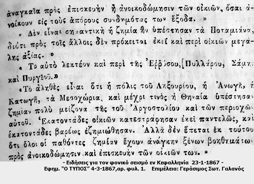 «Η καταστροφή αυτού του χωριού ήταν τόσον τέλεια, ώστε δεν ηδύνατο τις να διακρίνει τα όρια των κτησμάτων εν τω πεδίω των ερειπίων. Ενταύθα εν τη κυρία εστία του σεισμού φαίνεται ότι ευθύς η πρώτη δόνησις απετέλεσε σχεδόν την καταστροφή».