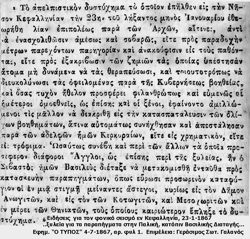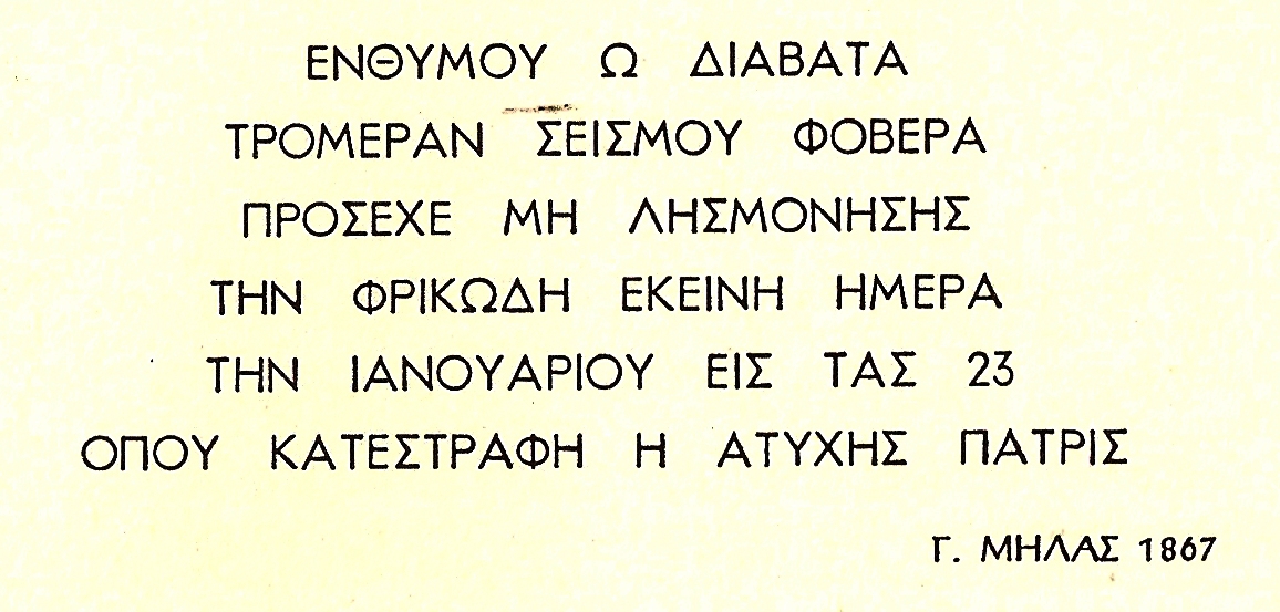 Τις 22 Ιανουαρίου, 1867, 8 η ώρα το απόγευμα έγινε ασθενής σεισμική δόνηση της γης για την οποία κανείς από τους κατοίκους δεν έδωσε προσοχή. Να ξημερώνει 23 Ιανουαρίου, ημέρα Δευτέρα και ώρα 6:00 π. μ. (πρωί) ακόμη, οι κάτοικοι ήταν στον ύπνο, έντρομοι εξεγέρθηκαν από σφοδρό σεισμό που διήρκεσε 25΄΄ – 30΄΄. Ακολούθησαν μικρότεροι σεισμοί και τις 11 το πρωί επαναλήφθηκαν μεγάλες δονήσεις που συμπλήρωσαν την καταστροφή. Ο ιστοριοδίφης Ηλίας Τσιτσέλης