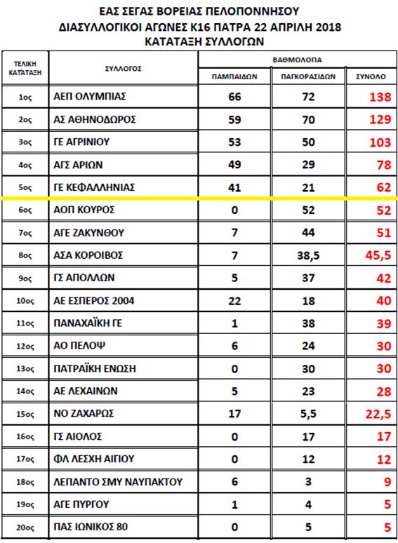 Συνολικά στην Πάτρα αγωνίστηκαν 25 αθλητές της Γ.Ε.Κ, πολλοί από αυτούς για πρώτη φορά εκτός Κεφαλονιάς, οι οποίοι με την προσπάθεια τους έφεραν την ομάδα μας στην 5η θέση της γενικής κατάταξης με 62 βαθμούς.