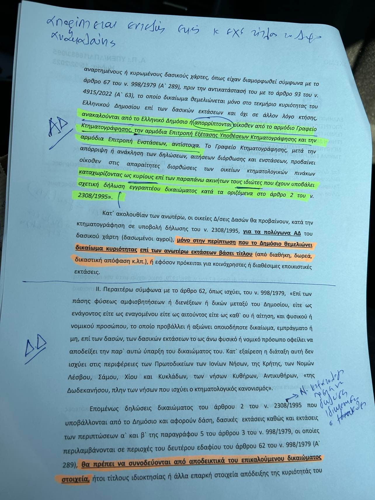 Για τα δάση και τις δασικές εκτάσεις οι δηλώσεις του δασαρχείου θα πρέπει να συνοδεύονται από αποδεικτικά του επικαλούμενοι δικαιώματος (τίτλο ιδιοκτησίας ή άλλα επαρκή στοιχεία απόδειξης της κυριότητάς του)