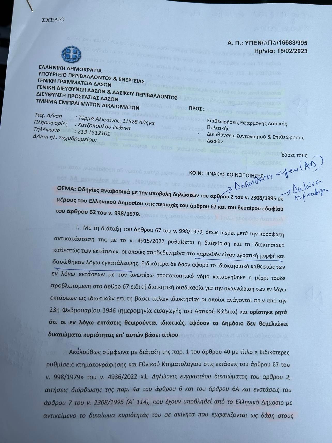 Για να μην ταλαιπωρούνται οι πολίτες και για την ορθή εφαρμογή του νόμου, εξεδόθη εγκύκλιος (ΑΔΑ: Ψ2ΨΠ4653Π8-1ΥΘ) από το Υπουργείο με οδηγίες προς τα Δασαρχεία που αποσαφηνίζει και απλουστεύει τη διαδικασία.