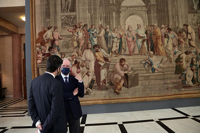 «Σήμερα η Βουλή των Ελλήνων υποδέχεται στο Περιστύλιό της το πιο σπουδαίο καλλιτεχνικά και διπλωματικά έργο τέχνης που έχει προσφερθεί ποτέ στο Κοινοβούλιο». Αυτό τόνισε ο Πρόεδρος της Βουλής, κ. Κωνσταντίνος Τασούλας, αμέσως μετά την τοποθέτηση του τοιχοτάπητα του 18ου αιώνα με θέμα «Η Σχολή των Αθηνών», που από σήμερα θα κοσμεί τη Βουλή των Ελλήνων, μετά από προσφορά του Προέδρου της Γαλλικής Εθνοσυνέλευσης, ως μια χειρονομία τιμής προς τη χώρα μας για τα 200 χρόνια από την Ελληνική Επανάσταση.