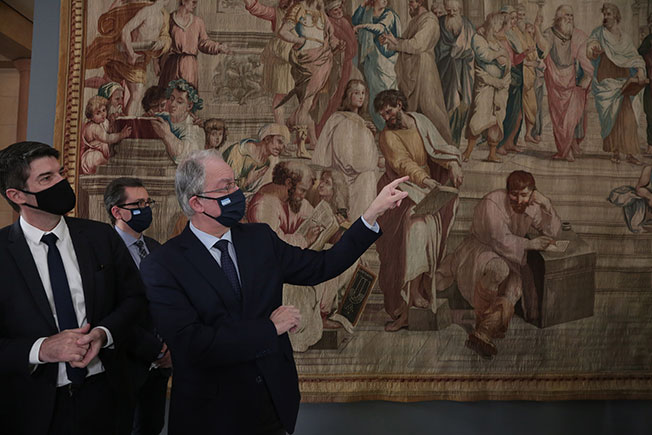 Όπως σημείωσε ο Πρόεδρος της Βουλής, είναι η πρώτη φορά από τότε που κατασκευάστηκε, το 1775, από το περίφημο εργοστάσιο Γκομπλέν στο Παρίσι, που ο  συγκεκριμένος τοιχοτάπητας φεύγει από τη Γαλλία, αλλά «επιστρέφει στην Αθήνα, στην πόλη τη Σχολή της οποίας με τόση καλλιτεχνική έμφαση αποδίδει».