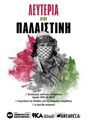 Γι’ αυτό ο αγώνας κατά της ελληνικής εμπλοκής και συνενοχής στο μακελειό στην Παλαιστίνη, υπέρ του αγώνα του παλαιστινιακού λαού, είναι κι αγώνας ενάντια στα καπιταλιστικά συμφέροντα κι ανταγωνισμούς, ενάντια στα ιμπεριαλιστικά σχέδια, υπέρ της φιλίας και συνεργασίας των λαών και όχι των εξοπλισμών και των πολέμων για ΑΟΖ και ενεργειακές μοιρασιές.