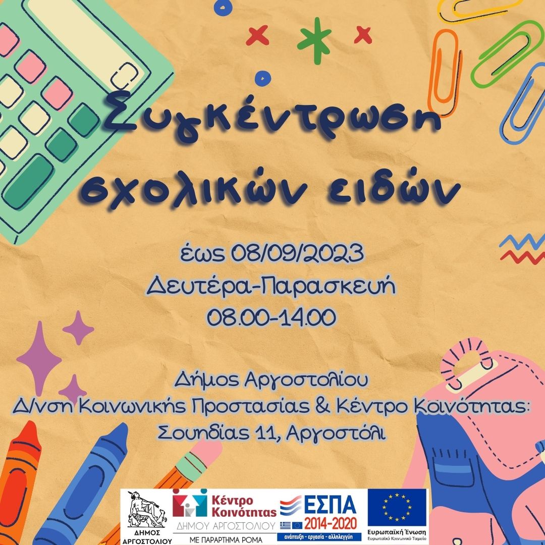H Δ/νση Κοινωνικής Προστασίας & Υγείας και το Κέντρο Κοινότητας με Παράρτημα Ρομά Δήμου Αργοστολίου εν όψει της νέας σχολικής περιόδου 2023-2024, ανακοινώνει την συγκέντρωση σχολικών ειδών (π.χ. σχολικές τσάντες, κασετίνες, γραφική ύλη, τετράδια κ.α.), καινούργια ή μεταχειρισμένα -σε καλή κατάσταση- με σκοπό να διατεθούν σε μαθητές/-τριες οικογενειών του Δήμου μας, που χρήζουν στήριξης.