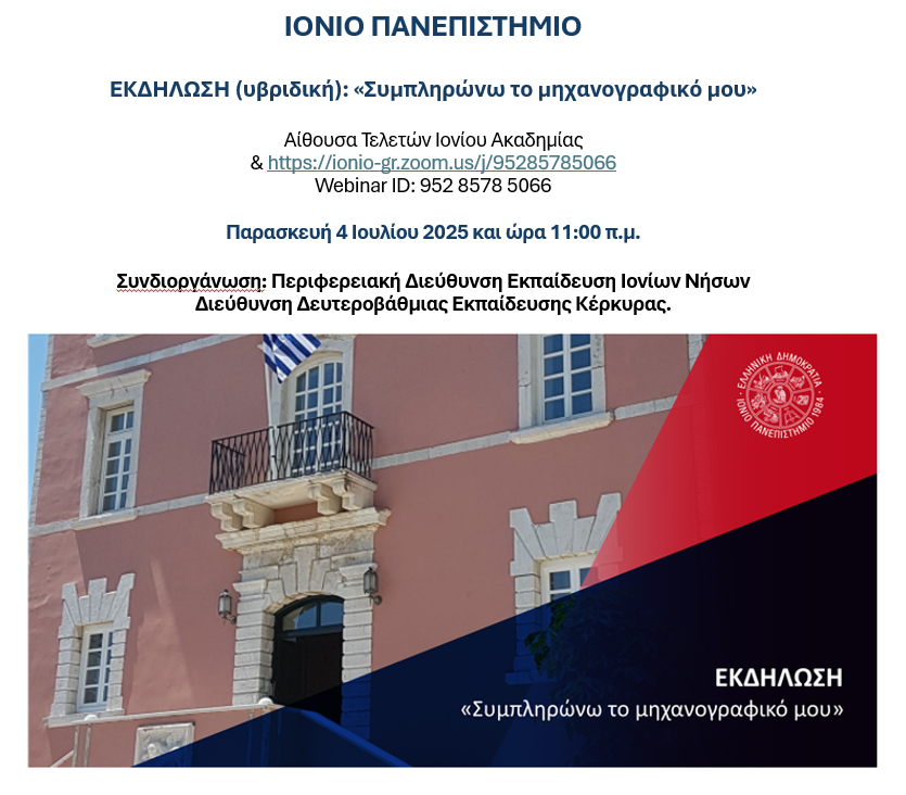 Το Ιόνιο Πανεπιστήμιο διοργανώνει εκδήλωση με θέμα: «Συμπληρώνω το Μηχανογραφικό μου», την Παρασκευή 4 Ιουλίου 2025 και ώρα 11:00, στην Αίθουσα Τελετών της Ιονίου Ακαδημίας, με τη συνεργασία της Περιφερειακής Διεύθυνσης Εκπαίδευσης Ιονίων Νήσων και της Διεύθυνσης Δευτεροβάθμιας Εκπαίδευσης Κέρκυρας.
