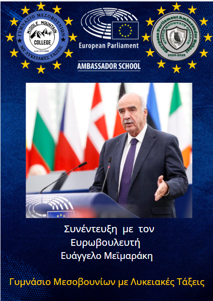 Το Γυμνάσιο Μεσοβουνίων με Λυκειακές Τάξεις στο πλαίσιο του προγράμματος «Σχολεία Πρέσβεις του Ευρωπαϊκού Κοινοβουλίου» πήρε μία συνέντευξη από τον Ευρωβουλευτή κ. Ευάγγελο Μεϊμαράκη με θέμα «Η πολιτική της Ευρωπαϊκής Ένωσης για την Τεχνητή Νοημοσύνη». Παραθέτουμε τα βασικά σημεία της συνέντευξης. Ολόκληρη μπορείτε να την παρακολουθήσετε στο κανάλι μας στο youtube: ΕΔΩ