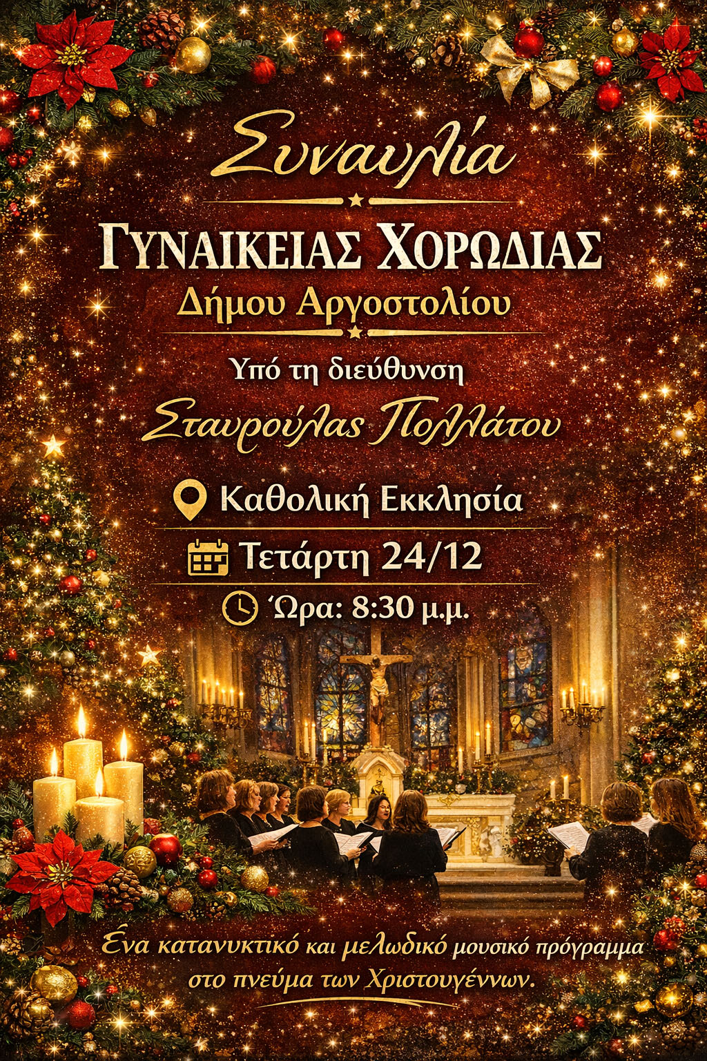 Η γιορτινή ατμόσφαιρα θα κορυφωθεί με τη συναυλία της ΓΥΝΑΙΚΕΙΑΣ ΧΟΡΩΔΙΑΣ του Δήμου Αργοστολίου, υπό τη διεύθυνση της Σταυρούλας Πολλάτου, η οποία θα πραγματοποιηθεί στην Καθολική Εκκλησία στις 8:30 μ.μ., χαρίζοντας στο κοινό ένα κατανυκτικό και αρμονικό μουσικό ταξίδι.