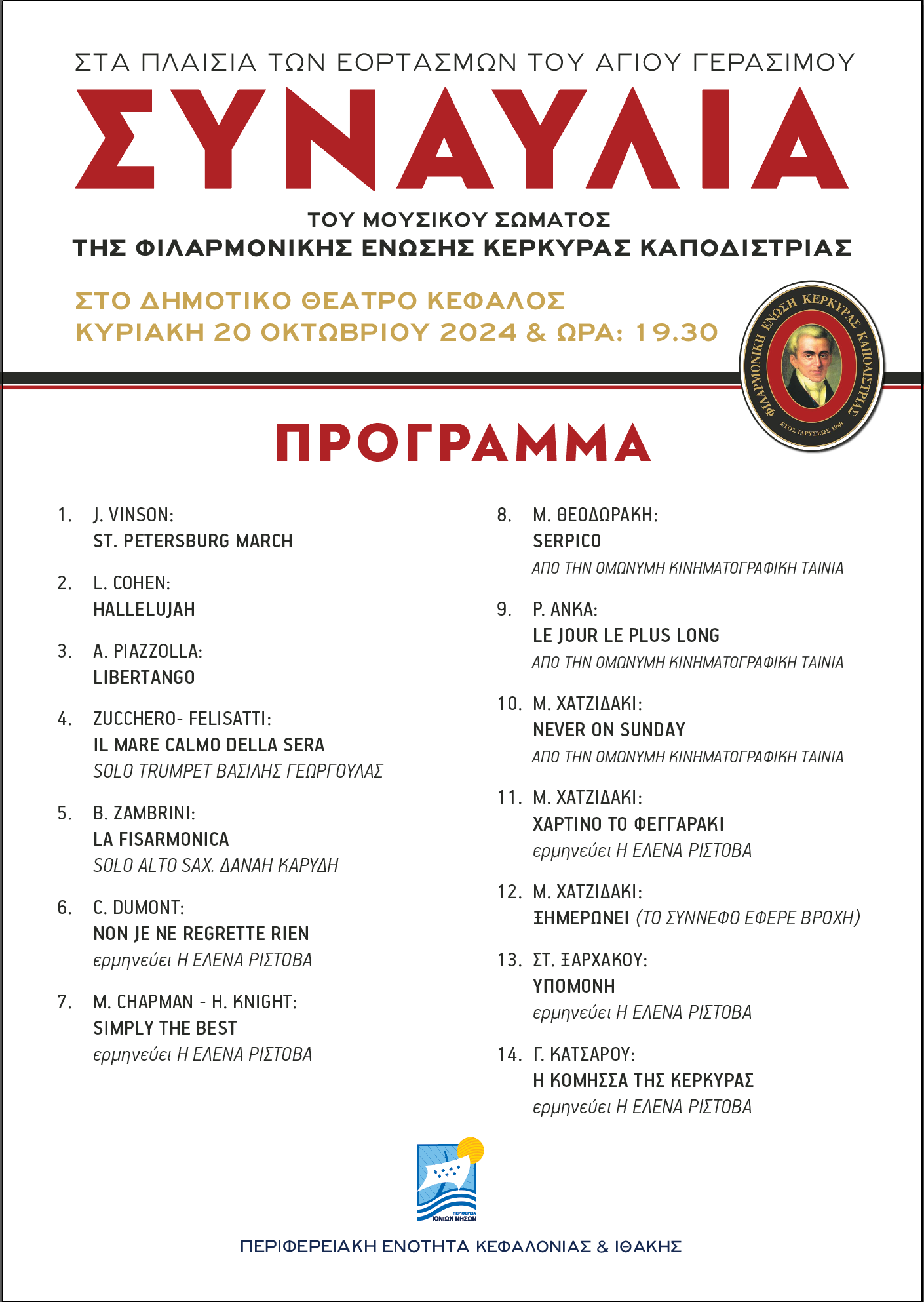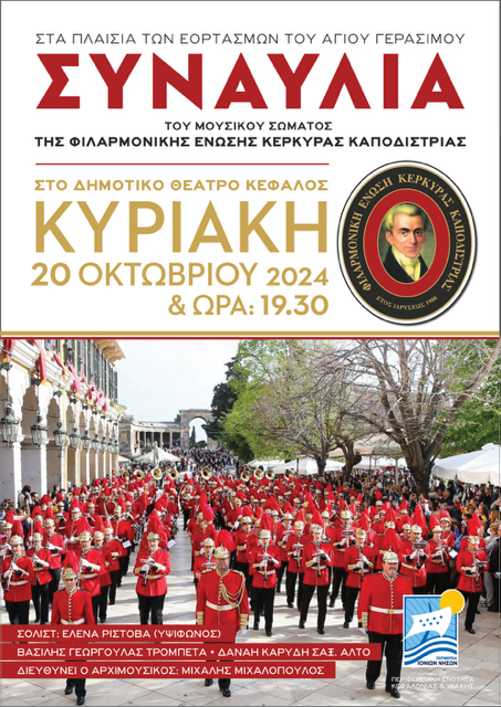 Με αφορμή τις θρησκευτικές εκδηλώσεις που αφορούν, τους εορτασμούς για τον Αγ.Γεράσιμο πολιούχο της Νήσου μας , η Περιφερειακή Ενότητα Κεφαλληνίας, στα πλαίσια της τόνωσης των δεσμών της με τα λοιπά Επτάνησα και της ανάδειξης του θεσμού των φιλαρμονικών, έχει την χαρά και την τιμή να φιλοξενήσει στο νησί μας την Φιλαρμονική Ένωση Κέρκυρας «Καποδίστριας», από τους σημαντικότερους μουσικούς και πολιτιστικούς οργανισμούς της Κέρκυρας.