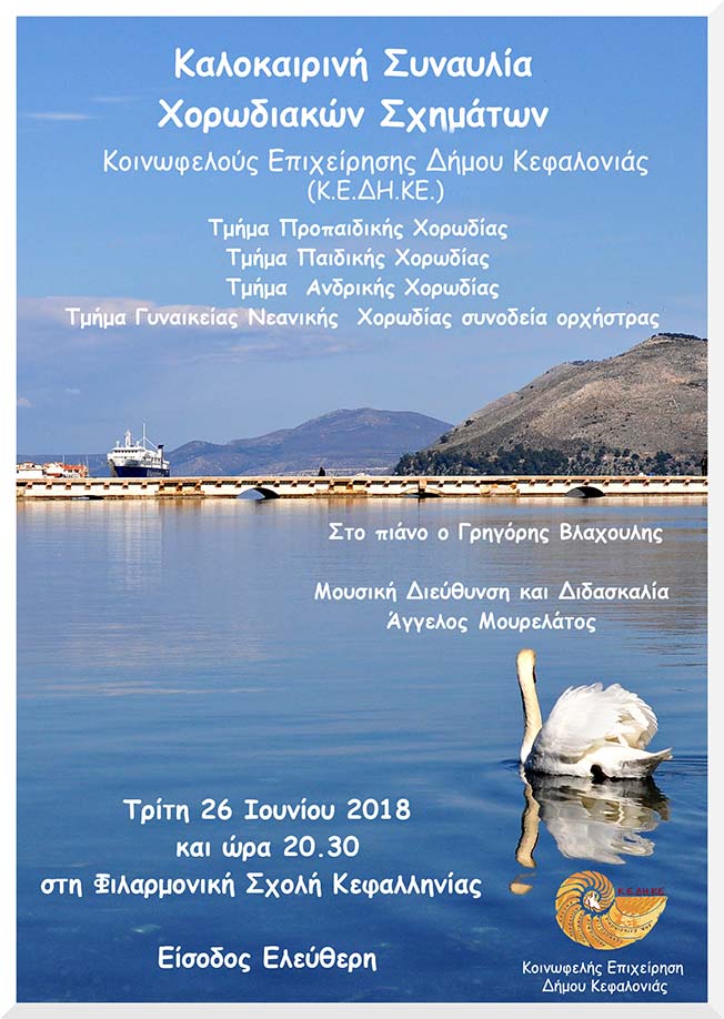 Συναυλία Χορωδιακών τμημάτων Αργοστολίου της Κ.Ε.ΔΗ.ΚΕ. θα πραγματοποιηθεί την Τρίτη, 26 Ιουνίου 2018 στην Φιλαρμονική Σχολή Κεφαλληνίας στις 8:30μμ.