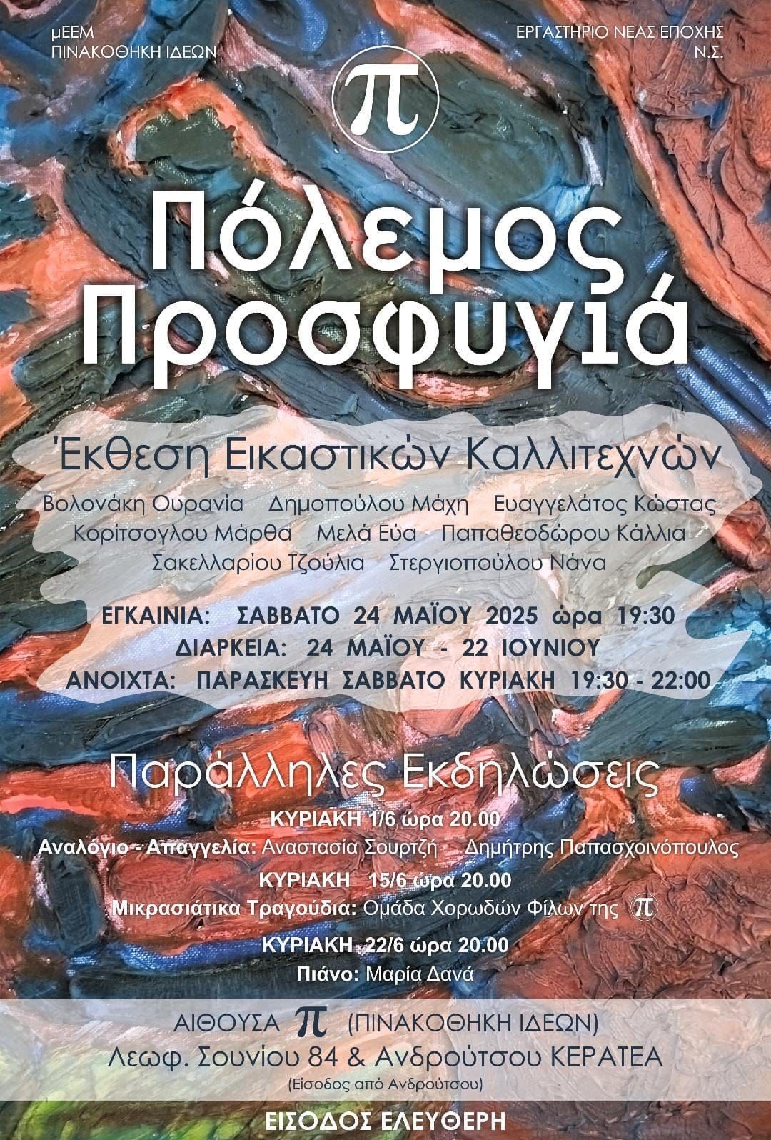 Συνεχίζεται με μεγάλη προσέλευση στην Π (πινακοθήκη ιδεών) της Κερατέας Αττικής η ομαδική εικαστική έκθεση “ΠΟΛΕΜΟΣ ΠΡΟΣΦΥΓΙΑ” και οι παράλληλες εκδηλώσεις λόγου και τέχνης μέχρι και τις 22 Ιουνίου 2025.