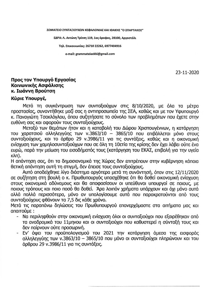 Σωματείο Συνταξιούχων Κεφαλονιάς προς τον Υπουργό Εργασίας.