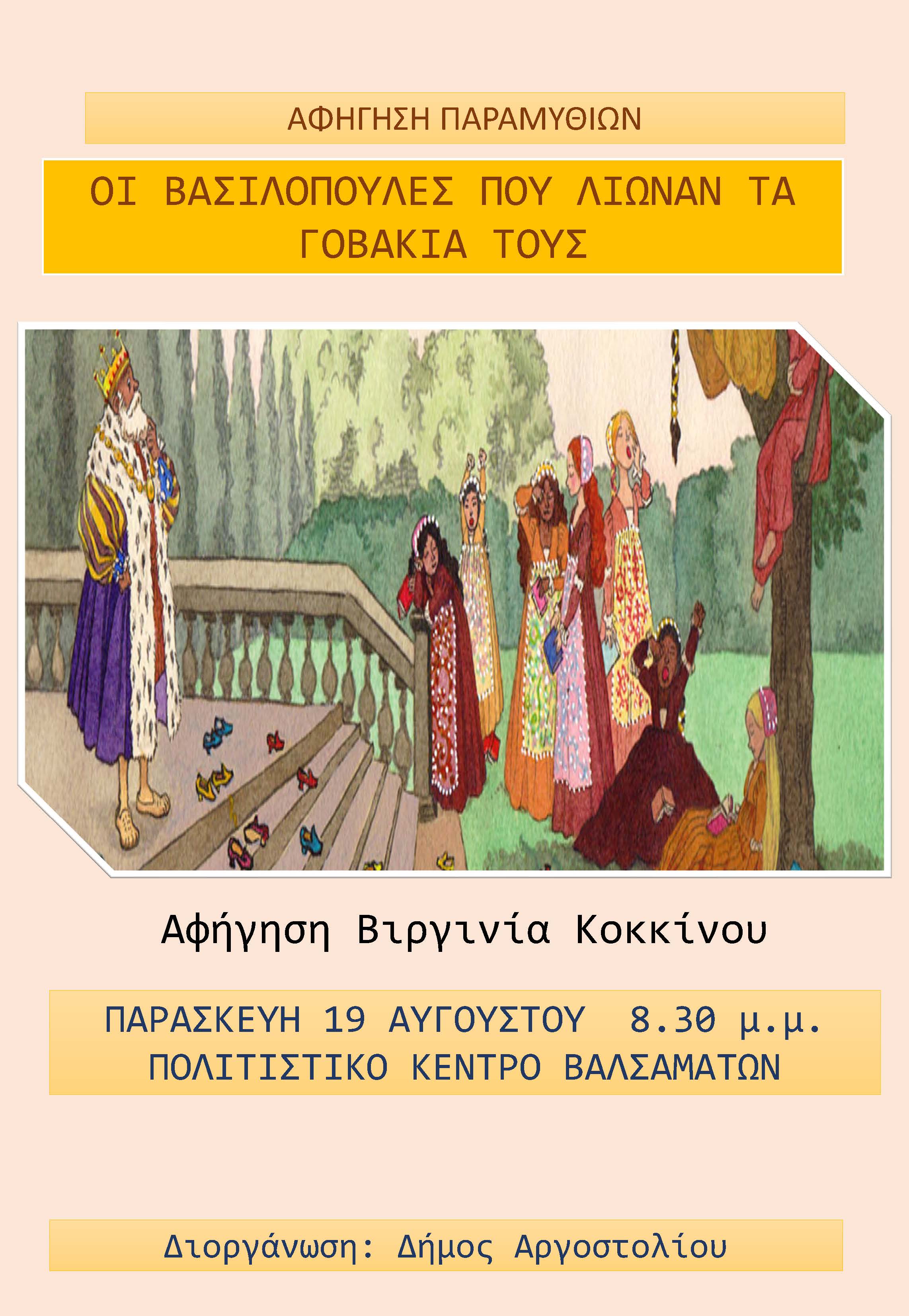 Σήμερα Παρασκευή 19 Αυγούστου στο Πολιτιστικό κέντρο ΒΑΛΣΑΜΑΤΩΝ, στις 20.30, τα ΠΑΡΑΜΥΘΟΚΑΜΩΜΑΤΑ θα παρουσιάσουν στους μικρούς μας φίλους την παράσταση «Οι βασιλοπούλες που λιώναν τα γοβάκια τους». Μια αφηγηματική παράσταση όπου ο κόσμος συμμετέχει στη ροή της ιστορίας λύνοντας αινίγματα και παίζοντας με τα ψέματα. Αφήγηση, Μουσική Βιργινία Κοκκίνου. Είσοδος Ελεύθερη. Οργάνωση Δήμος Αργοστολίου.
