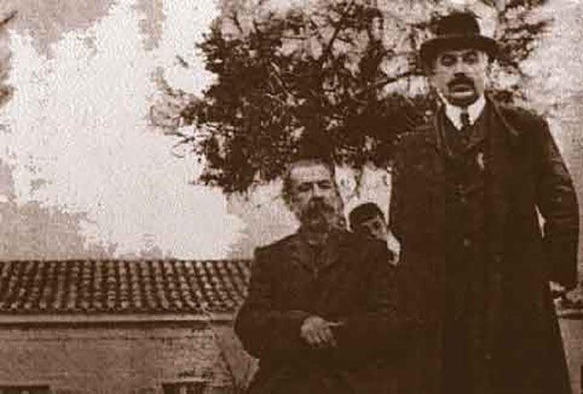| Μια σπάνια φωτογραφία του 1906: Ο Αλέξανδρος Παπαδιαμάντης με τον φίλο του Γιάννη Βλαχογιάννη, στο καφενεδάκι της Δεξαμενής, όπου σύχναζε ο κυρ-Αλέξανδρος. |