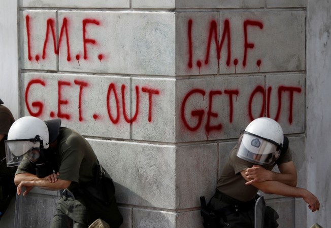 Αστυνομικοί των ΜΑΤ μπροστά από γκράφιτι στο κέντρο της Αθήνας που γράφουν «Έξω το ΔΝΤ». Η φωτογραφία ελήφθη την 5η Μαΐου 2010, ημέρα μεγάλων διαδηλώσεων που σημαδεύτηκε από τον τραγικό θάνατο εργαζομένων στο υποκατάστημα της τράπεζας Marfin το οποίο πήρε φωτιά από βόμβες μολότοφ
