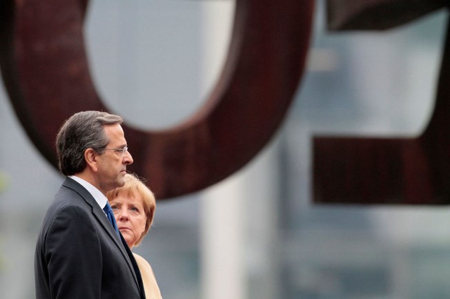 Η Γερμανίδα καγκελάριος Άνγκελα Μέρκελ με τον Έλληνα πρωθυπουργό Αντώνη Σαμαρά κατά τη διάρκεια επίσκεψης του δεύτερου στο Βερολίνο, στις 24 Αυγούστου 2012. Λίγο πριν τη συνάντηση με τον κ. Σαμαρά, η Άνγκελα Μέρκελ δήλωσε ότι ούτε ο χρόνος, ούτε το περιεχόμενο του νέου πακέτου διάσωσης προς την Ελλάδα μπορεί να τύχει επαναδιαπραγμάτευσης