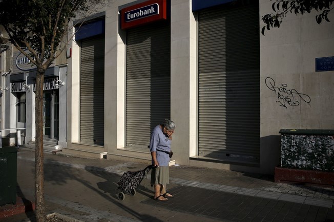Γυναίκα σέρνει καρότσι για ψώνια έξω από υποκατάστημα τράπεζας, στις 29 Ιουνίου 2015, λίγο μετά την επιβολή των capital controls