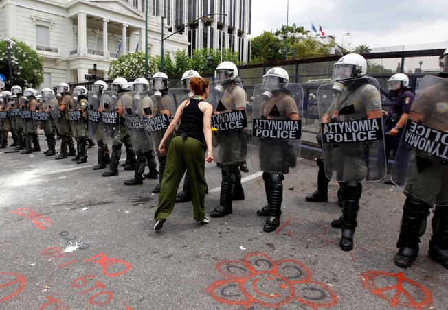 Διαδηλώτρια φωνάζει σε δυνάμεις των ΜΑΤ έξω από την ελληνική βουλή στις 15 Ιουνίου 2011