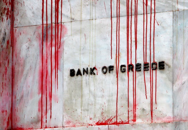 Διαδηλωτές πέταξαν κόκκινη μπογιά στην Τράπεζα της Ελλάδας κατά τη διάρκεια διαδήλωσης στις 6 Δεκεμβρίου 2010 που διοργανώθηκε με αφορμή τη συμπλήρωση δύο ετών από τη δολοφονία του 15χρονου μαθητή Αλεξάνδρου Γρηγορόπουλου, εν μέσω ολοένα διογκούμενης δυσαρέσκειας εναντίον της κυβέρνησης για τη λιτότητα