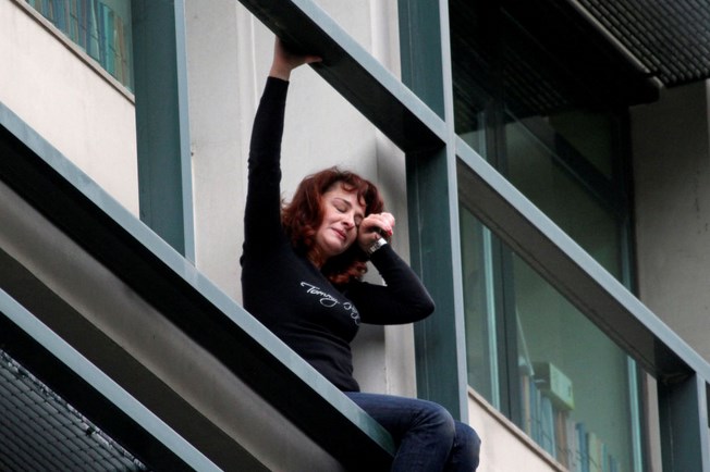 Η Λαμπρούση Χαρίκλεια, υπάλληλος του Οργανισμού Εργατικής Κατοικίας με δάκρυα στα μάτια απειλεί να βουτήξει στο κενό επειδή η ίδια και ο σύζυγός της απειλούνταν με απόλυση, καθώς ο οργανισμός που δούλευαν ήταν μεταξύ αυτών που θα έκλειναν στο πλαίσιο περικοπής των κρατικών δαπανών. Η φωτογραφία τραβήχτηκε στις 15 Φεβρουαρίου 2015