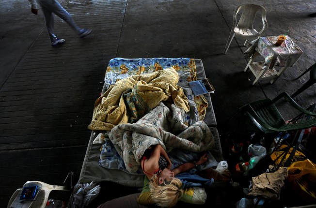 Η 42χρονη Μαριαλένα, άστεγη, φορέας του AIDS και πρώην χρήστης ναρκωτικών που ακολουθεί πρόγραμμα απεξάρτησης με μεθαδόνη κοιμάται κάτω από μία γέφυρα στο κέντρο της Αθήνας, στις 13 Μαΐου 2013. Από την αρχή της κρίσης το 2009, εκατοντάδες χιλιάδες Έλληνες έχασαν τη δουλειά τους, με το ποσοστό ανεργίας να εκτοξεύεται στο 26,8% τον Μάρτιο του 2013. Σύμφωνα με την ΜΚΟ Κλίμακα υπήρχαν περίπου 20.000 άστεγοι στην Ελλάδα το 2012.