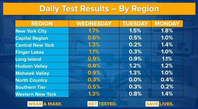 Η πολιτεία της Νέας Υόρκης κάνει κάθε μέρα 50.000 τεστ για COVID-19. Μάλιστα, τα αποτελέσματα ανακοινώνονται την επόμενη μέρα και έτσι παρακολουθούν τα ποσοστά σε όλες τις περιοχές της πολιτείας (στη φωτογραφία ο ημερήσιος πίνακας θετικών κρουσμάτων ανά περιοχή). Με αυτό τον τρόπο έχουν τη δυνατότητα να προσαρμόζονται και να αντιδρούν πολύ γρήγορα αν παρατηρηθεί κάποια συρροή κρουσμάτων. Αυτή τη στιγμή όποιος θέλει πάει και εξετάζεται χωρίς να υπάρχει κάποιος ιδιαίτερος λόγος.