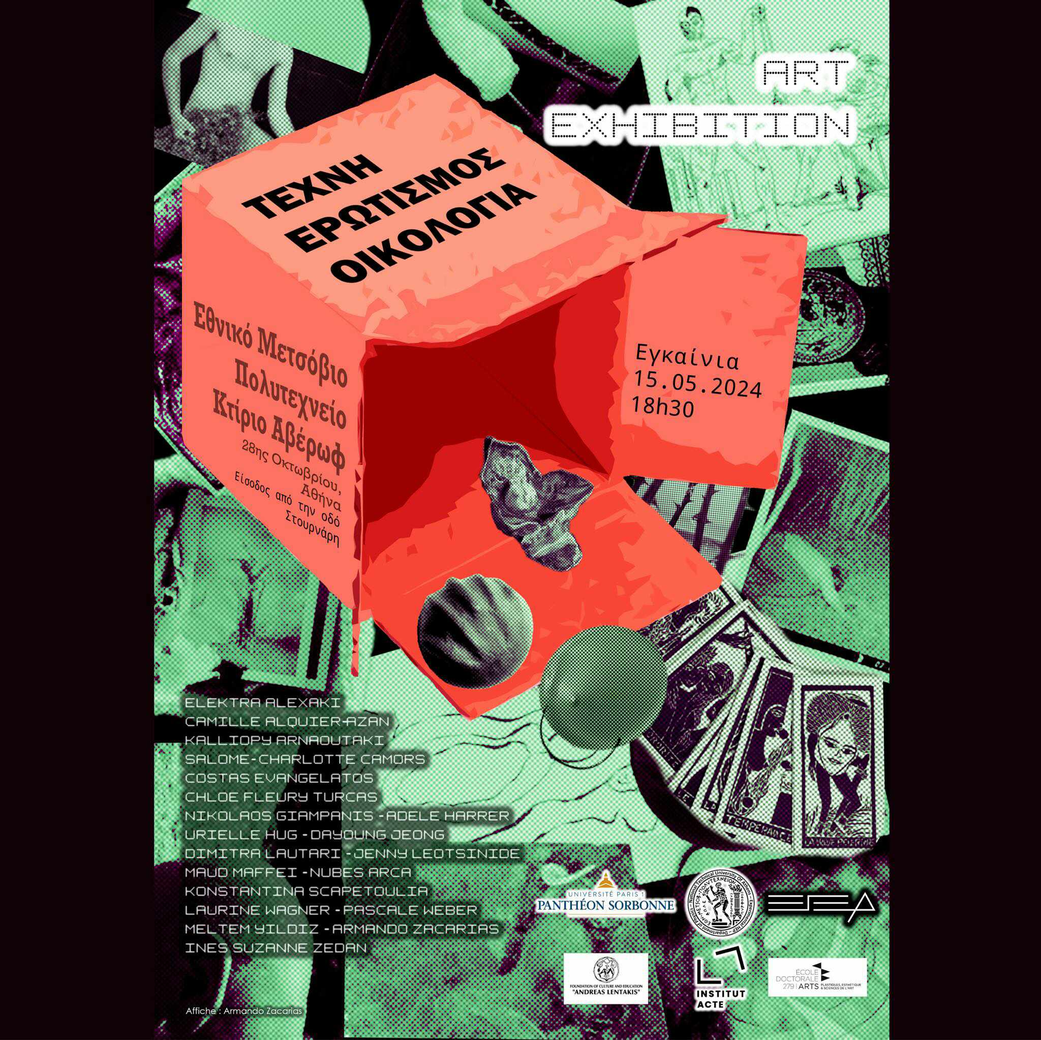 Η έκθεση Τέχνη, Ερωτισμός, Οικολογία θα πραγματοποιηθεί στις 15 και 16 Μαίου 2024, στα πλαίσια διεθνούς διημερίδας φιλοσοφίας, ιστορίας της τέχνης και αισθητικής στην μεγάλη Αίθουσα “Λύσανδρος Καυταντζόγλου” του Κτιρίου Αβέρωφ του Εθνικού Μετσόβιου Πολυτεχνείου (ΕΜΠ) στην Αθήνα, ως αντίστιξη στο ομώνυμο συμπόσιο που συνδιοργανώνει το University Paris 1- Πάνθεον Σορβόννης, Ελληνική Φιλοσοφική Εταιρεία. Η εικαστική έκθεση συγκεντρώνει έργα που μαρτυρούν την ευχάριστη, ζωτική και συμβολική σχέση του σώματος με το φυσικό ή τεχνητό περιβάλλον. Απαρτίζεται από 20 καλλιτέχνες διαφόρων εθνικοτήτων, που ζουν στην Ελλάδα και τη Γαλλία. Κάθε έργο χωράει σε ένα κλειστό κουτί. Ως αποτέλεσμα, τα έργα που φιλοτεχνήθηκαν στη Γαλλία μεταφέρθηκαν από το Παρίσι σε αποσκευές. Εν μέρει, λοιπόν, πρόκειται για μια «έκθεση σε βαλίτσα», που θυμίζει το «boîtes en valise» του Marcel Duchamp. Η ερωτική έκθεση κυκλοφορεί σχεδόν λαθραία, σαν να ήταν προσωπικά εφέ του θεωρητικού της τέχνης Πασκάλ Βέμπερ. Στη συνέχεια, οι καλλιτέχνες είναι ελεύθεροι να ενσωματώσουν τα κουτιά στις δικές τους καλλιτεχνικές συνθέσεις στο χώρο. Τα έργα αυτά μας ταξιδεύουν πίσω στην ευθραυστότητα της ευαίσθητης εμπειρίας, στο μυστήριο της ερωτικής επιθυμίας, αλλά και στην πληθωρικότητα των ζωντανών και στην τρέλα της αγάπης και της υβριδικότητας. Είναι ευτύχημα που αυτή η έκθεση πραγματοποιείται στην Αθήνα, στο σπίτι του Έρωτα, της Αφροδίτης, της Σαπφούς, του Ορφέα, του Πάνα, όλων των ειδών Σατύρων και υβριδικών όντων – με λίγα λόγια, στο λίκνο μιας μυθολογίας που διαπερνά ολόκληρη την Ευρώπη και βοηθά να ζούμε σε αυτή την ερωτική, απαραίτητη, αμοιβαία και συνεχή ανταλλαγή με τη σάρκα του κόσμου.